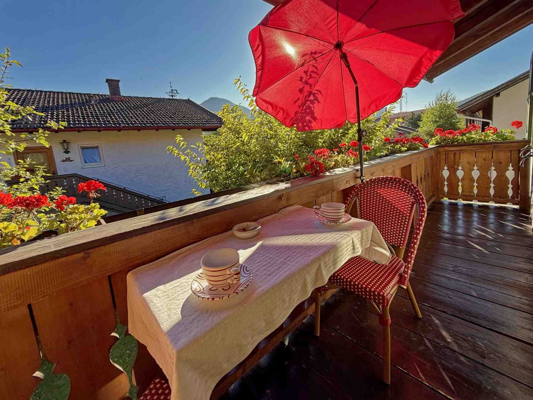 Der Südbalkon lädt mit Tisch, Stühlen und Sonnenschirm bei einem herrlichen Gebirgsblick zum Verweilen ein.
