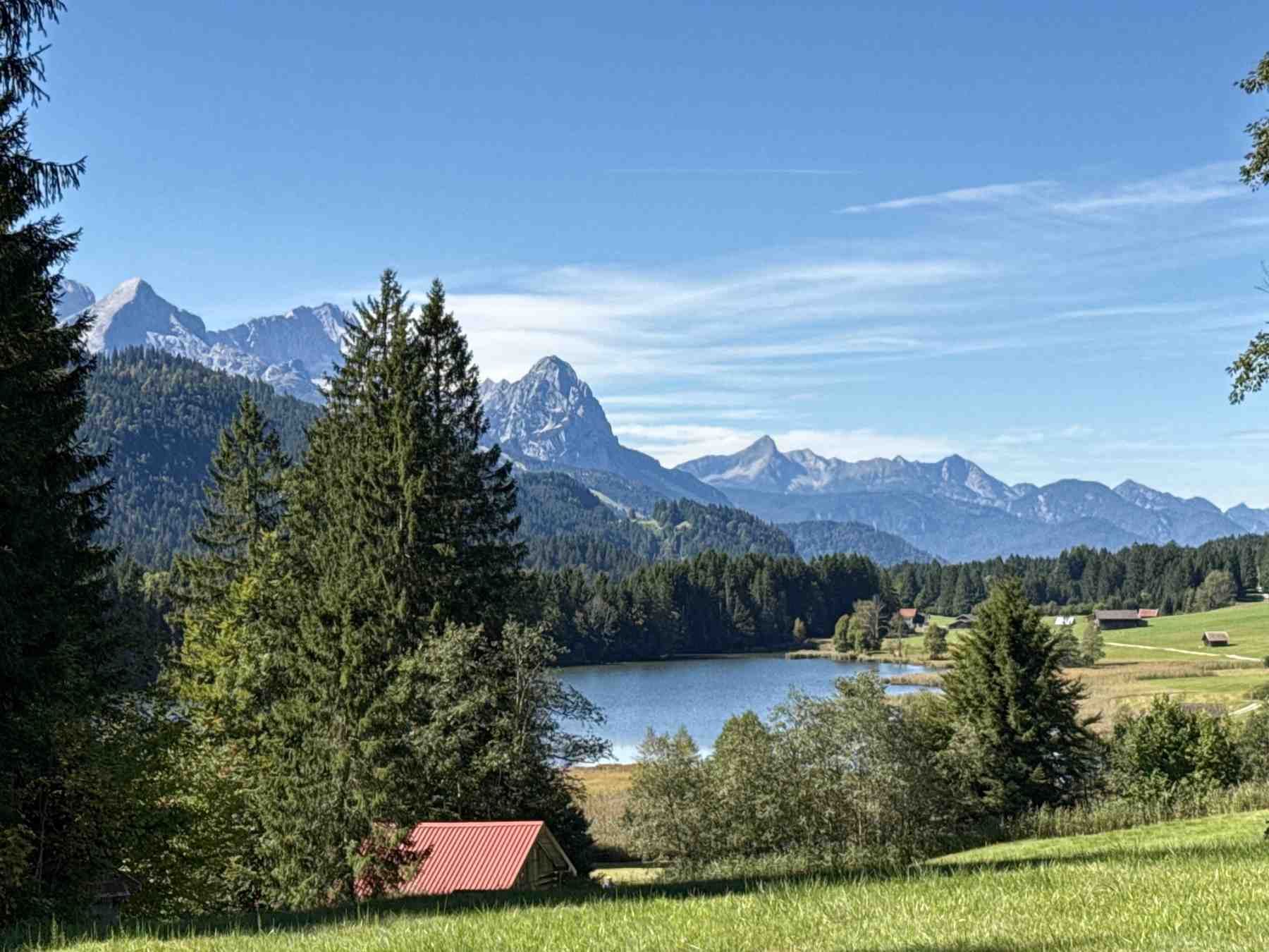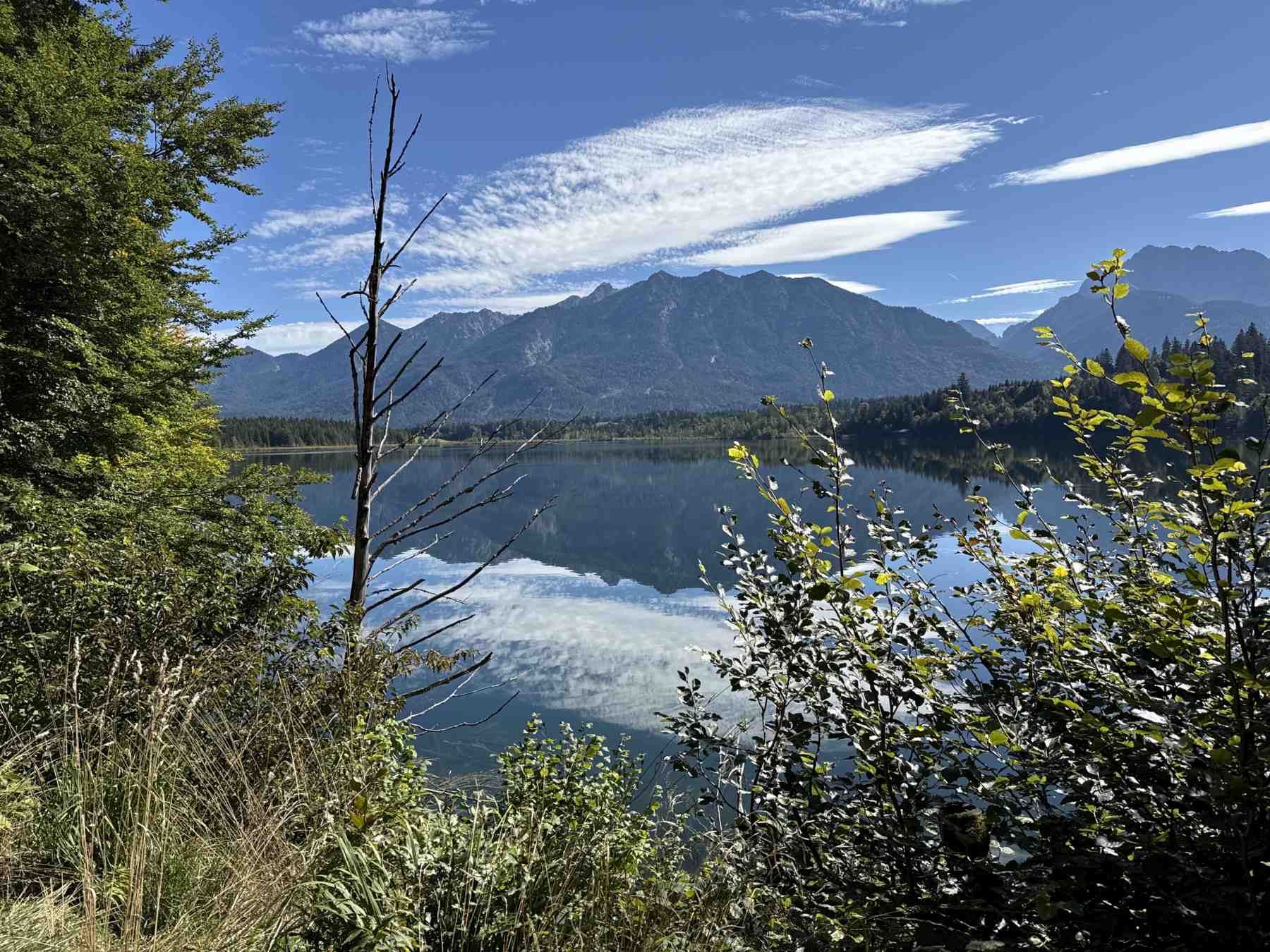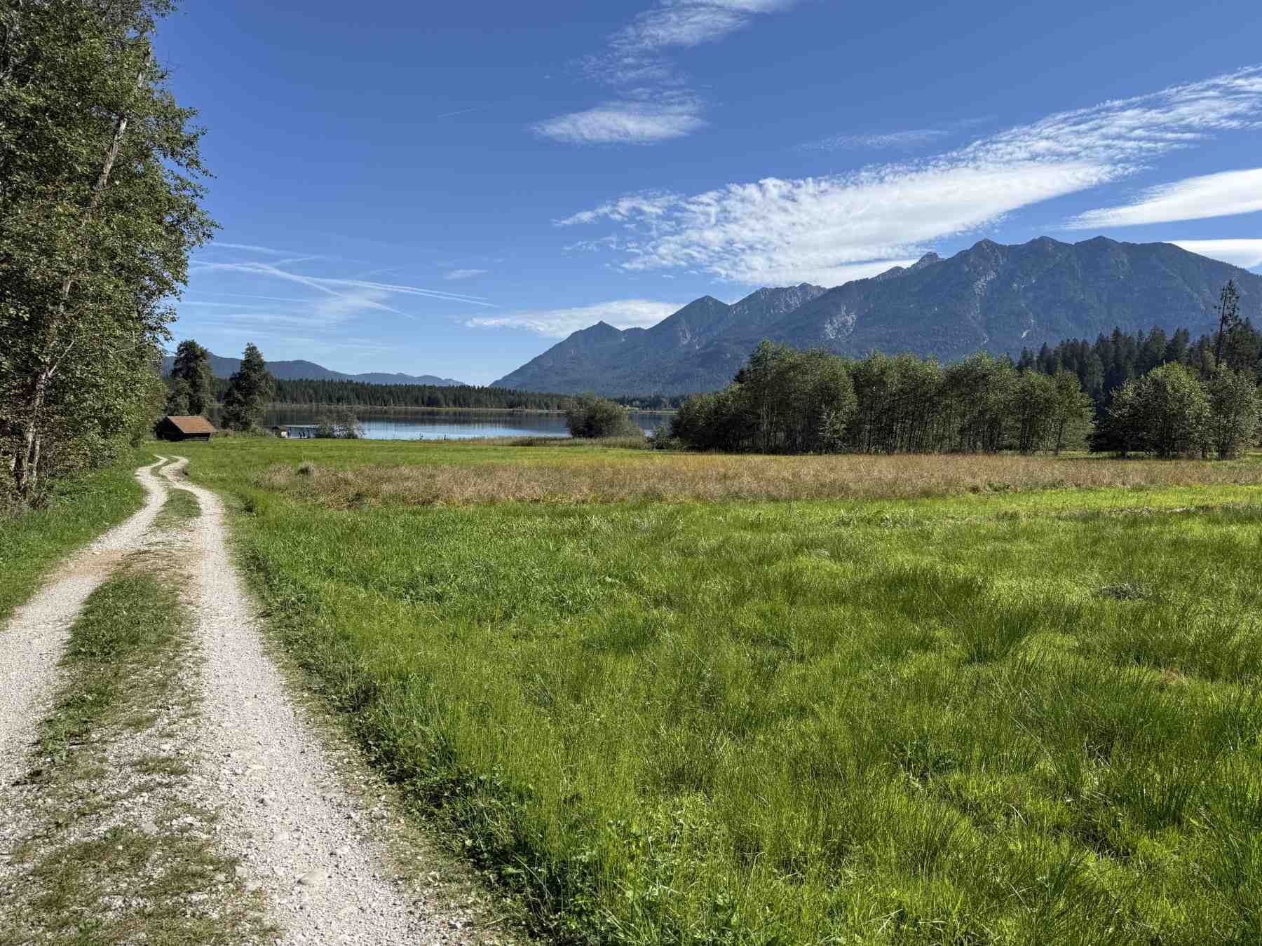 Im Anschluss gehen wir am bewaldeten Seeufer in Richtung der Badestelle und weiter durch Wiesen in Richtung Krün.