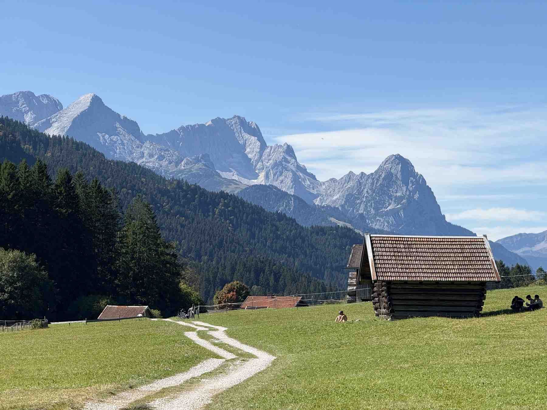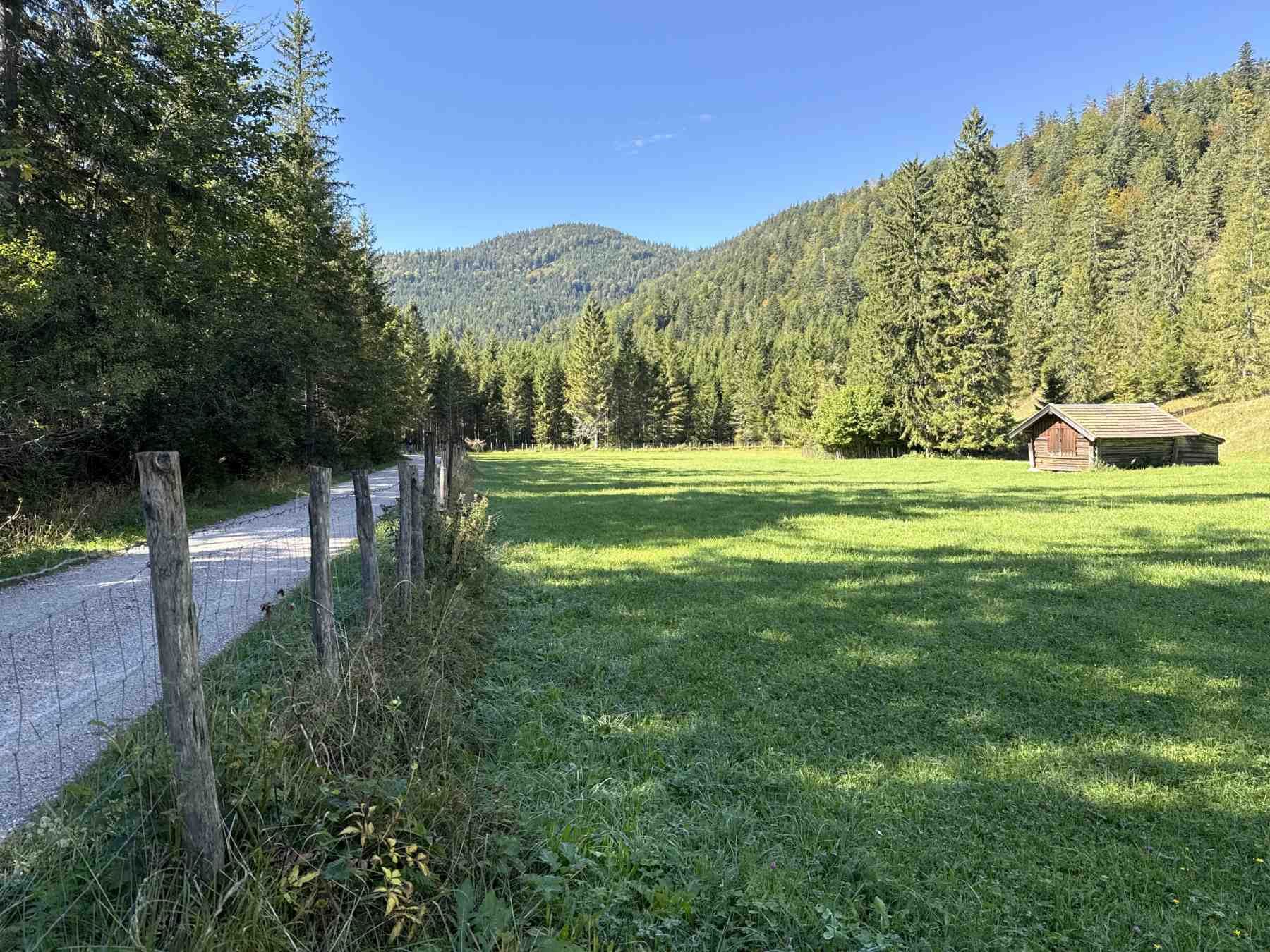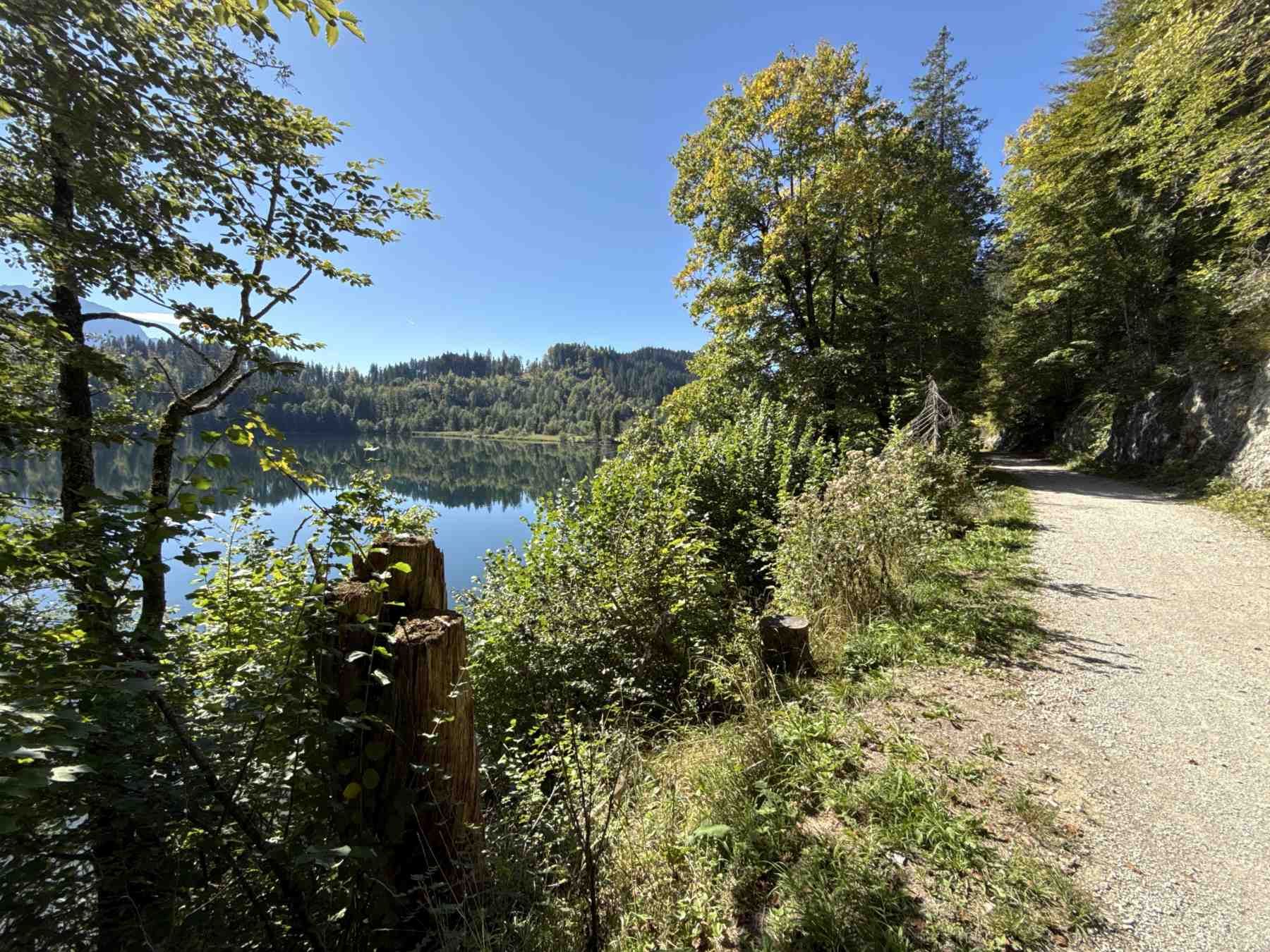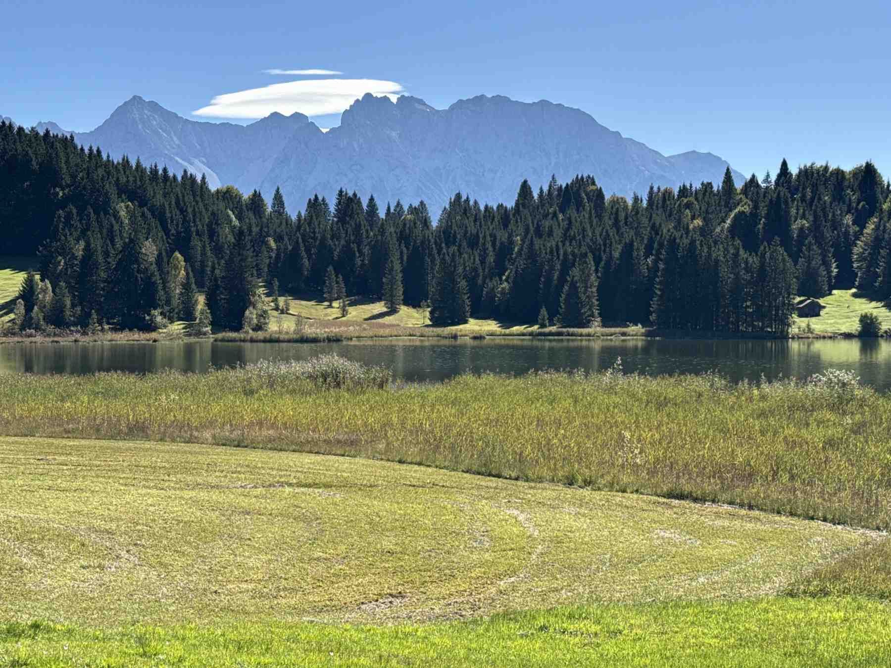 Im Anschluss gehen wir am bewaldeten Seeufer in Richtung der Badestelle und weiter durch Wiesen in Richtung Krün.