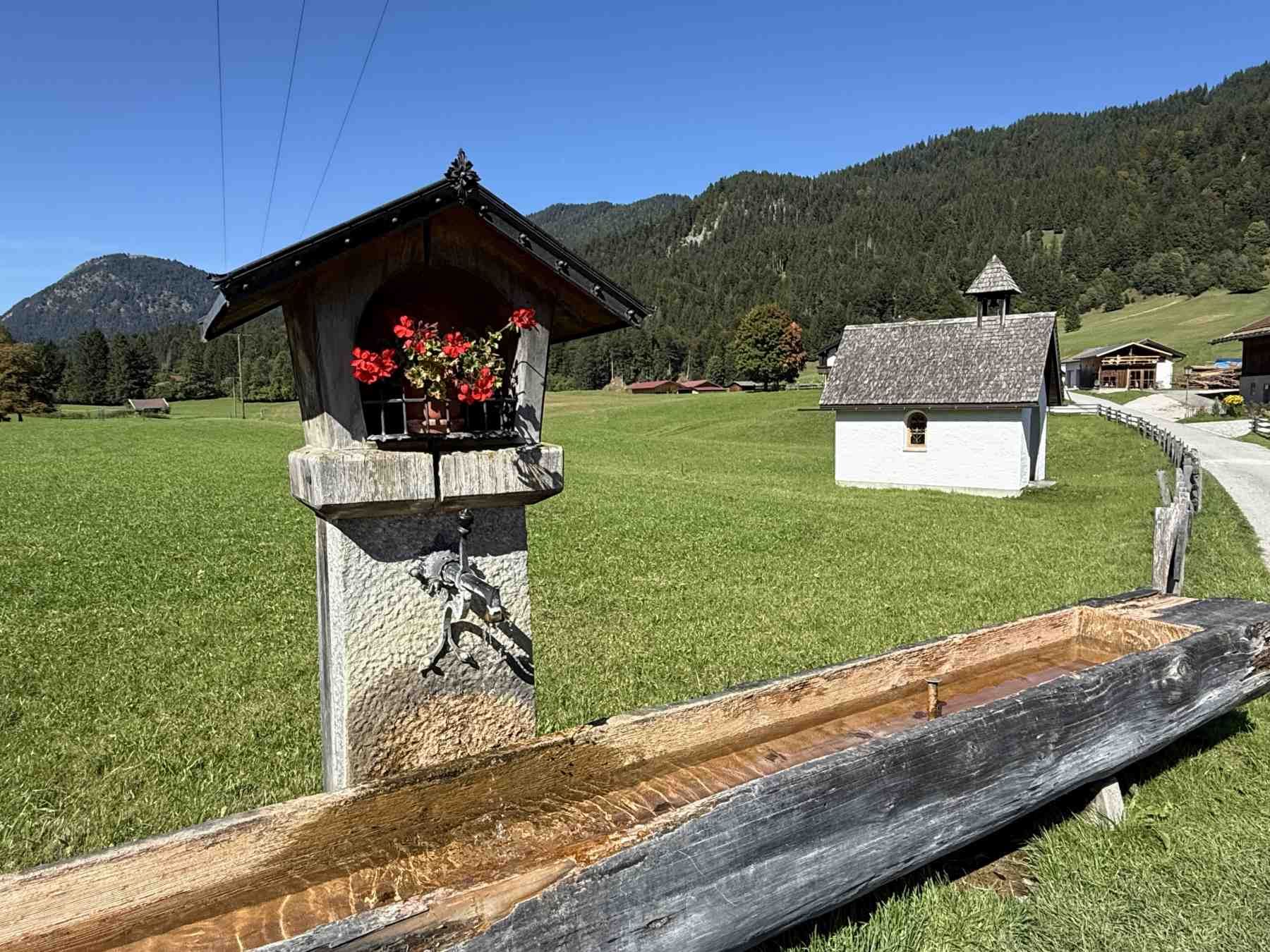 In Gerold gehen wir vorbei am Brunnen und der kleinen Kapelle bevor wir nach rechts durch die Wiesen am Geroldsee vorbei wandern - mit einem schönen Blick auf das Karwendel im Hintergrund.